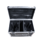Estuche rígido vacío para transportar dos cabezas móviles Aura Wash de 19x15. Al abrirlo, se encuentran dos espacios vacíos para guardarlas de forma segura. El estuche es robusto, con bordes y molduras de aluminio, asas laterales y cierres de mariposa. Estuche de transporte de la línea profesional Wisdom.